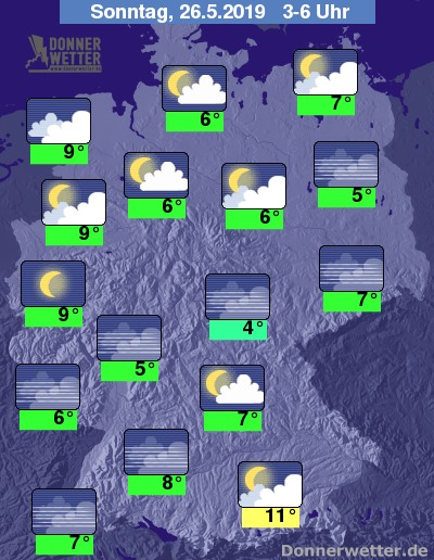 In den Nachtstunden zeigt sich der Himmel meist locker oder aufgelockert bewölkt, vor allem in der Süd- und Osthälfte Deutschlands kann sich im Nachtverlauf Nebel bilden. Südlich der Donau fallen anfangs noch letzte Schauer, die im Verlauf der zweiten Nachthälfte aber abklingen.