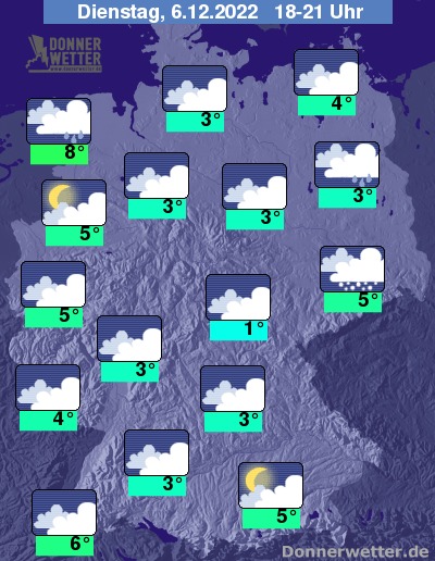 In den Abendstunden zeigt sich der Himmel bis auf wenige Auflockerungen vor allem im Nordwesten und am Alpenrand bedeckt. Einzelne Schauer, die oberhalb von 400 m auch als Schnee fallen können, sind zunächst noch im Nordseeküstenumfeld sowie in der Osthälfte möglich.