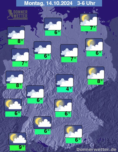 In der Nacht zum Montag fällt im Nordosten zunächst noch etwas Regen, im weiteren Verlauf abziehend. In den übrigen Landesteilen ist es wolkig, im Südwesten auch gering bewölkt, und es bleibt trocken.