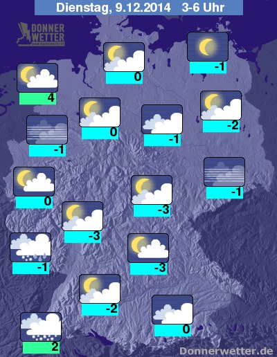 In der Nacht zum Dienstag fällt im Südwesten Deutschlands unter dichten Wolken noch zeitweise etwas Schnee oder Schneeregen, sonst ist es ebenfalls oft stark, gebietsweise aber auch aufgelockert bewölkt und trocken. Im Osten und Nordosten wird es teils klar. Stellenweise bildet sich Nebel oder Hochnebel mit entsprechender Glättegefahr durch Rauhreif oder überfrierende Nässe. Die Temperatur sinkt auf 4 Grad in Emden und bis -3 Grad im Coburger Land.