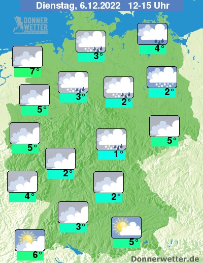 Am Dienstagnachmittag zeigt sich der Himmel über weiten Landesteilen stark bewölkt oder es ist bedeckt; Auflockerungen sind in den nächsten Stunden vor allem südlich der Donau sowie später lokal auch im Nordwesten möglich. In der Nord- und Osthälfte muss im Tagesverlauf zeitweise mit Regen-, Schneeregen- oder Schneeschauern gerechnet werden, in der West- und Südwesthälfte bleibt es meist trocken.