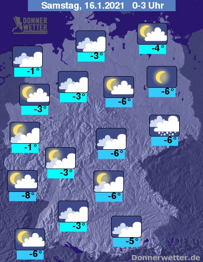 Während der zweiten Nachthälfte können in den östlichen Mittelgebirgen sowie an den bayerischen Alpen noch leichte Schneeschauer auftreten. Sonst bleibt es wechselnd wolkig, aber in der Regel niederschlagsfrei. Besonders im Nordosten leuchten die Sterne auch für längere Zeit.