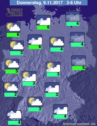 In der Nacht zum Donnerstag bringen dichte Wolken im Südwesten gebietsweise Regen oder Schneeregen, auch sonst bleibt es im Süden meist bedeckt und hier und da ist etwas Regen oder Schneeregen möglich. Weiter nach Norden hin ist es hingegen überwiegend locker oder aufgelockert bewölkt, zum Teil auch sternenklar, dabei bleibt es trocken. Die Temperatur sinkt auf 6 Grad an der Nordsee und bis 2 Grad im Saargau.