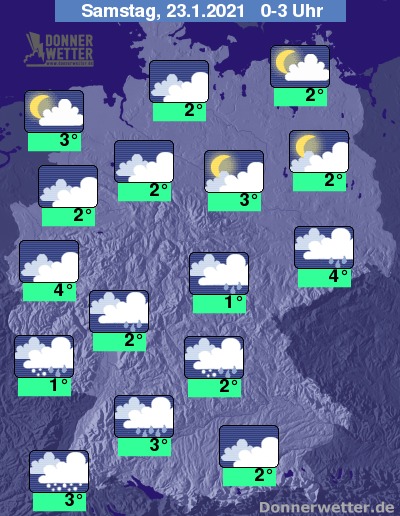 Während der zweiten Nachthälfte kommen die Niederschläge allmählich ostwärts voran und breiten sich über der gesamten Südhälfte aus, bevor es dann später westlich des Rheins abtrocknet. Der Regen kann teilweise bis in Lagen von 300 bis 400 Metern in Schnee übergehen oder zumindest mit Schneeflocken vermischt sein. Im übrigen Land bleibt es teils stärker, teils aufgelockert bewölkt.
