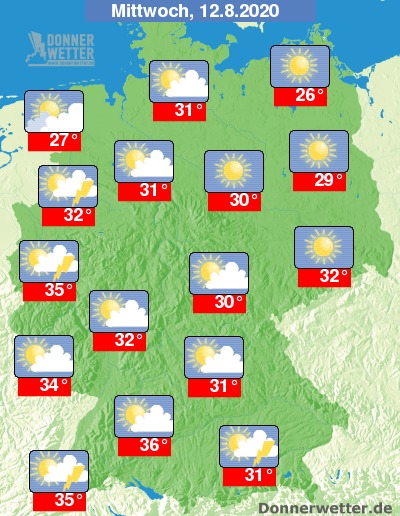 Die Höchsttemperaturen erreichen Werte zwischen 29 und 37 Grad, dabei wird es zum Teil unangenehm schwül. Etwas angenehmer bleibt es an den Küsten, sowie auf den Gipfeln der Mittelgebirge mit 24 bis 28 Grad.