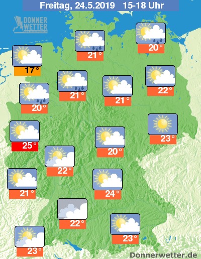 Am frühen Nachmittag wechseln sich sonnige Abschnitte mit Wolken ab. Von NRW, über Niedersachsen bis hin zur Ostsee, sowie über den Mittelgebirgen können die Haufenwolken auch mal mächtiger werden und örtliche Regengüsse produzieren, vereinzelt kann es dabei auch blitzen und donnern. Sonst bleibt es jedoch vorwiegend trocken.