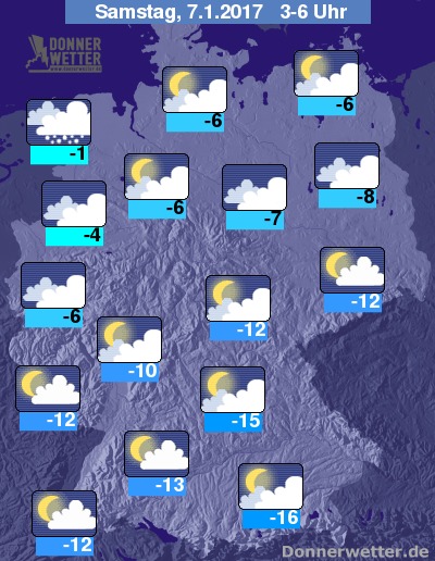 In der bevorstehenden Nacht werden die Wolken im Norden und Westen immer dichter und im westlichen Niedersachsen kommen leichte Schneefälle auf. Weiter nach Südosten ist es hingegen meist nur locker bewölkt, teils auch klar und es bleibt trocken. Stellenweise hält sich Nebel oder Hochnebel. Die Temperatur sinkt auf -1 Grad in Emden und bis auf eisige -16 Grad in München.