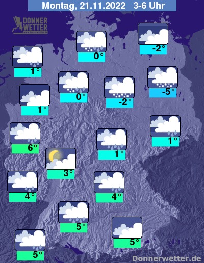 Am Montag ist es den Tag über überwiegend stark bewölkt oder trüb, teilweise auch nebelig. Auflockerungen zeigen sich am ehesten in einem Streifen von NRW bis nach Bayern. Es fällt gelegentlich etwas Regen, über der Nordosthälfte meistens Schneeregen oder Schnee, oft bleibt es aber auch trocken. Die Temperatur steigt auf 1 Grad in Magdeburg und bis 10 Grad in Köln.
