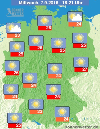 Heute Abend sind im Umfeld der Nord- und Ostseeküste hier und da lockere Wolkenfelder unterwegs, sonst scheint die Sonne jedoch meist von einem wolkenlosen Himmel. Dabei bleibt es landesweit trocken. Die Temperatur liegt bei 23 Grad an der Nordseeküste und um 27 Grad in der Lausitz.