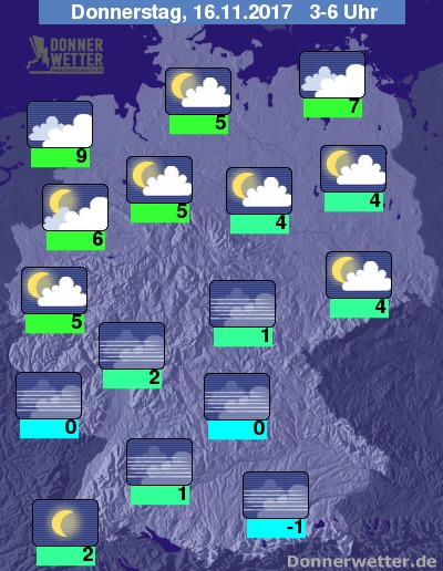 In der Nacht zum Donnerstag ist es über dem Norden oft stark bewölkt, dazu fällt nur in Küstennähe noch anfangs hier und da Regen. Von der breiten Landesmitte bis in den Süden der Republik zeigt sich der Himmel oft sternenklar und sonst locker bewölkt, dazu bleibt es trocken. Stellenweise bildet sich Nebel oder Hochnebel. Die Temperatur sinkt auf 9 Grad an der Nordsee und bis -1 Grad am Alpenrand.