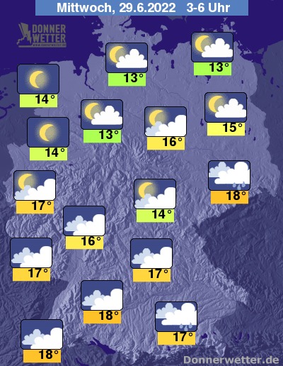 In der folgenden Nacht bleibt der Himmel über dem Westen und Norden meist locker bewölkt oder sternenklar. Im Süden und über Sachsen ist es anfangs bereits weitgehend stark bewölkt, hierzu sind vereinzelt Schauer möglich. Im Nachtverlauf wird auch die Bewölkung über der übrigen Südosthälfte immer dichter, dazu bleibt es aber trocken. Die Temperatur sinkt auf 18 Grad in Stuttgart und 13 Grad in Hamburg.
