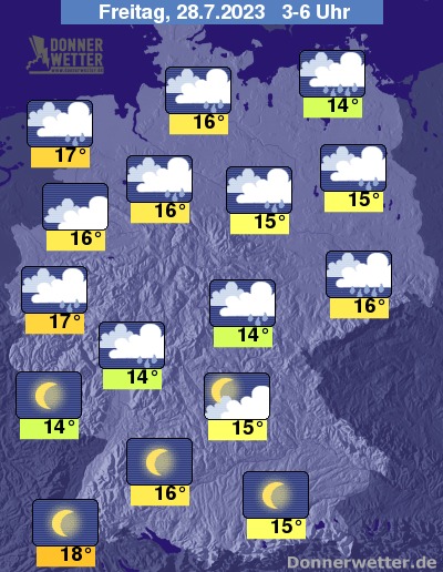 In der folgenden Nacht zeigt sich der Himmel über dem Süden Deutschlands verbreitet sternenklar. Sonst ziehen dagegen meist dichte Wolken durch und es bilden sich gebietsweise Schauer. Die Temperatur sinkt auf 18 Grad in Freiburg und bis etwa 14 Grad in Neubrandenburg.