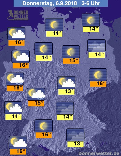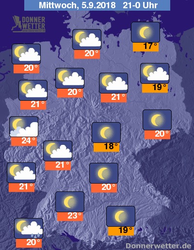 In der zweiten Nachthälfte breiten sich dann in feuchter Luft Nebelfelder weiter aus. Sonst funkeln vielfach bei leichter Bewölkung die Sterne. Nur im Westen fallen aus dichteren Wolken vereinzelte Schauer. Die Temperaturen sinken in den Frühstunden auf laue 13 bis 18 Grad. Die tiefsten Werte findet man dabei in einigen Mittelgebirgstälern, sowie an den Alpen. Am mildesten bleibt es in den Ballungsgebieten des Westens.