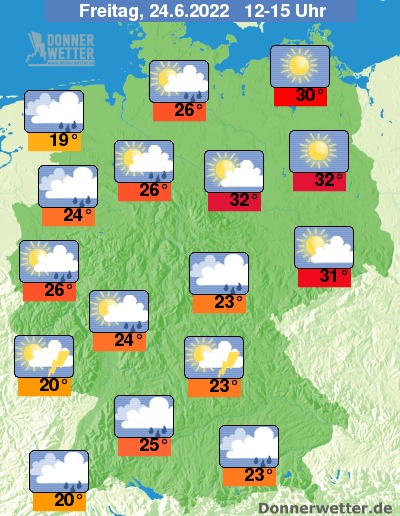 Heute Nachmittag bleibt es im Süden meist dicht bewölkt und es bilden sich vielerorts Schauer, sowie einzelne Gewitter. Vor allem im Osten scheint noch oft die Sonne, hier bleibt es meist trocken. Im übrigen Land ist es teils stark, teils aufgelockert bewölkt und es können sich sowohl einzelne Schauer als auch örtliche Gewitter bilden. Die Temperatur liegt bei 19 Grad an der Nordsee und 32 Grad in der Magdeburger Börde.