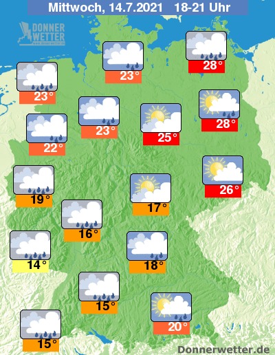 Heute Abend bilden sich vor allem im Norden und Westen vielerorts Schauer und auch Gewitter. Von der Mitte des Landes bis nach Osten ist es jedoch auch verbreitet heiter bis sonnig und dazu weitgehend trocken. Sonst ist es oft stark, teils aufgelockert bewölkt und es fällt gebietsweise Regen. Die Temperatur liegt bei nasskühlen 14 Grad im Saargau und schwülwarmen 28 Grad im Großraum Berlin.