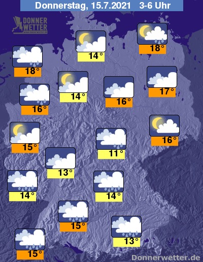 In der Nacht zum Donnerstag können sich im Norden weitere, teils kräftige Schauer und Gewitter bilden, oft lockert es aber auch etwas auf. Im Süden bleibt es weitgehend bedeckt und es fällt zeitweise Regen. Im übrigen Land ist es aufgelockert oder stark bewölkt und zumeist trocken. Die Temperatur sinkt auf 18 Grad in Rostock und bis 11 Grad in Jena.