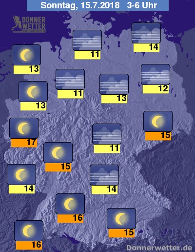 In der kommenden Nacht können sich über dem Süden anfangs noch vereinzelt Schauer und Gewitter bilden. Im übrigen Land zeigt sich der Himmel weitgehend sternenklar und es bleibt trocken. Die Temperatur sinkt auf 17 Grad in der Kölner Bucht und bis auf 11 Grad im Norddeutschen Tiefland.