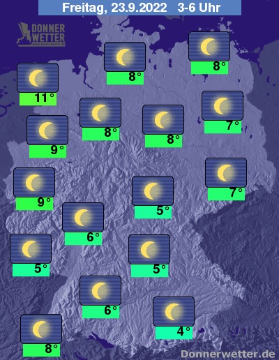 In der Nacht zum Freitag funkeln über Deutschland verbreitet die Sterne von einem wolkenlosen Himmel. Bei Tiefstwerten von 11 Grad in Cuxhaven und bis 4 Grad in München bleibt es überall trocken.