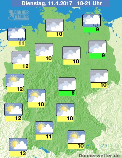 Heute Abend fällt im Küstenumfeld unter dichten Wolken zeitweise Regen. Über der übrigen Nordosthälfte bleibt es zwar zumeist trocken, aber auch größtenteils stark und nur hier und da kann es mal etwas aufgelockert bewölkt. Freundlicher mit mehr Sonnenschein wird es im Süden und Westen Deutschlands, hier bleibt es trocken. Die Temperatur liegt bei 8 Grad im Thüringer Becken und noch bis 13 Grad in Freiburg.