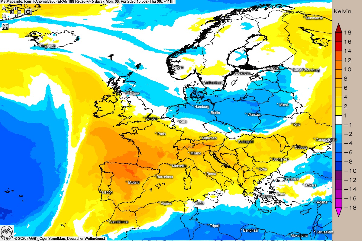 Die Wetterkarte für Ostermontag (06:00 Uhr) sowie Temperaturen und Temperaturabweichung um 15:00 Uhr nach ICON: