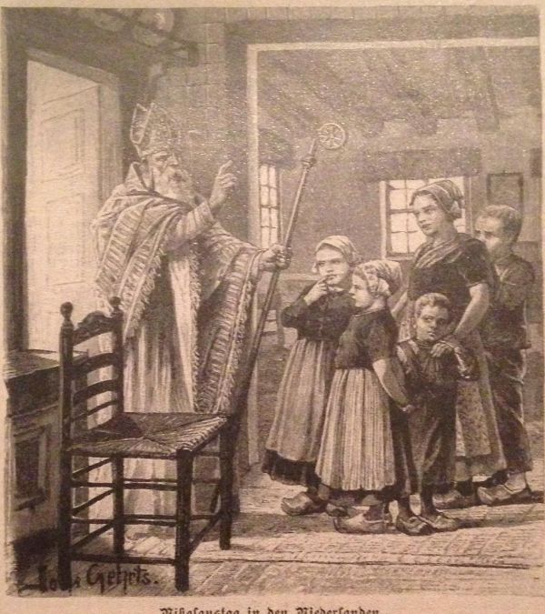 Unser alter Holzstich zeigt den niederländischen Sinterklaas am Pakjesavond: