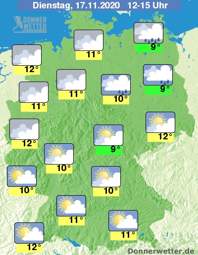 In der Mitte und im Süden teils größere Aufheiterungen, im Norden trüb.