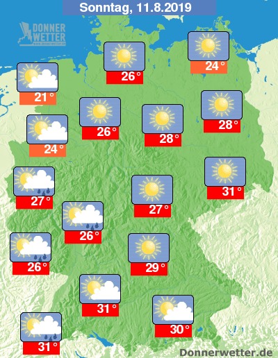 Am Sonntag ist es im Land zunächst landesweit heiter bis sonnig und dabei trocken, gegen frühen Abend ziehen in den westlichen Landesteilen jedoch oft dichte Wolken herein und es sind einzelne Schauer und Gewitter möglich. Die Temperatur steigt auf 21 Grad an der Nordsee und bis 31 Grad im Breisgau.