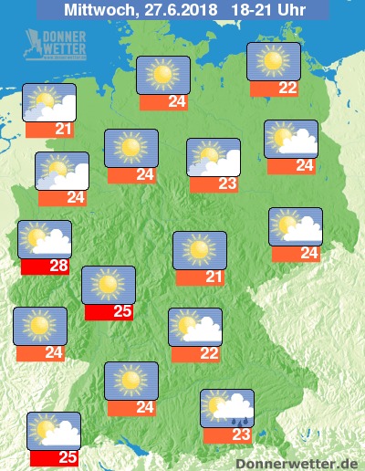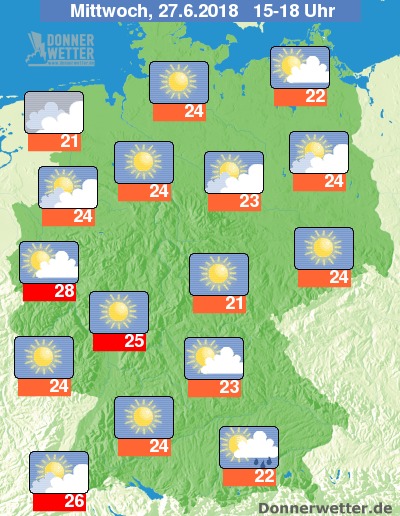 Das entspannte Rudelgucken bzw. der Fußballnachmittag auf der Terrasse ist nämlich in weiten Landesteilen gerettet. Zwar zeigt sich nicht überall ungestört die Sonne, vor allem im Nordwesten und Nordosten können auch mal Wolken durchziehen; die Temperaturen sind mit Höchstwerten um 21 bis 28 Grad C aber perfekt für's Jubeln unter freiem Himmel.