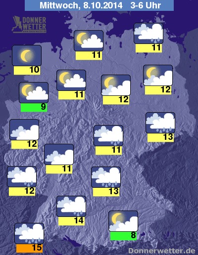 In der Nacht zum Mittwoch fällt vor allem in der Südosthälfte des Landes immer wieder Regen, sonst ist es zumeist trocken. Vor allem im Nordwesten zeigt sich der Himmel aber auch vielfach klar oder nur locker bewölkt, hier bleibt es weitgehend trocken. Im Nordseeumfeld weht noch ein teils stürmischer Wind, dabei sind weiterhin einzelne Sturmböen möglich. Die Temperatur sinkt auf 15 Grad in Freiburg und bis 8 Grad im Allgäu.