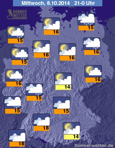 In der Nacht zum Donnerstag bleibt der Himmel aufgelockert bis stark bewölkt, dabei fällt gebietsweise auch Regen, zumeist bleibt es aber trocken. Stellenweise bildet sich Nebel oder Dunst. Im Westen und an der Nordsee weht weiterhin ein zeitweise frischer bis starker Wind. Die Temperatur sinkt bis zum Morgen auf 16 Grad in der Kölner Bucht und bis 10 Grad in Oberbayern.