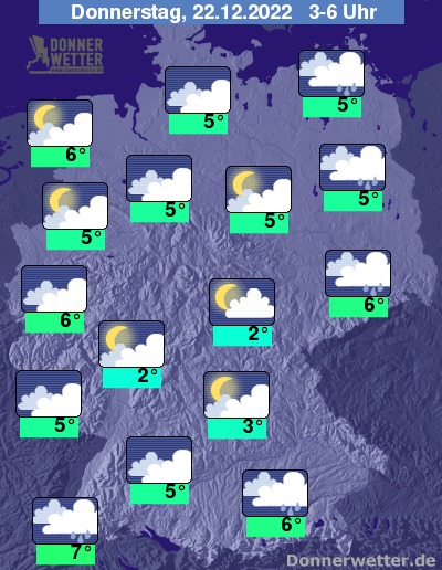 In der Nacht zum Donnerstag ist es nach Westen hin schon trocken. Weiter nach Osten hin fällt noch zeitweise Regen, der im Nachtverlauf nach Polen und Tschechien abzieht, dann ist es überall trocken und es kann hier und da auch auflockern. Oft bleibt es aber dicht bewölkt. Die Temperatur sinkt auf 7 Grad am Oberrhein und 2 Grad im Grabfeld.