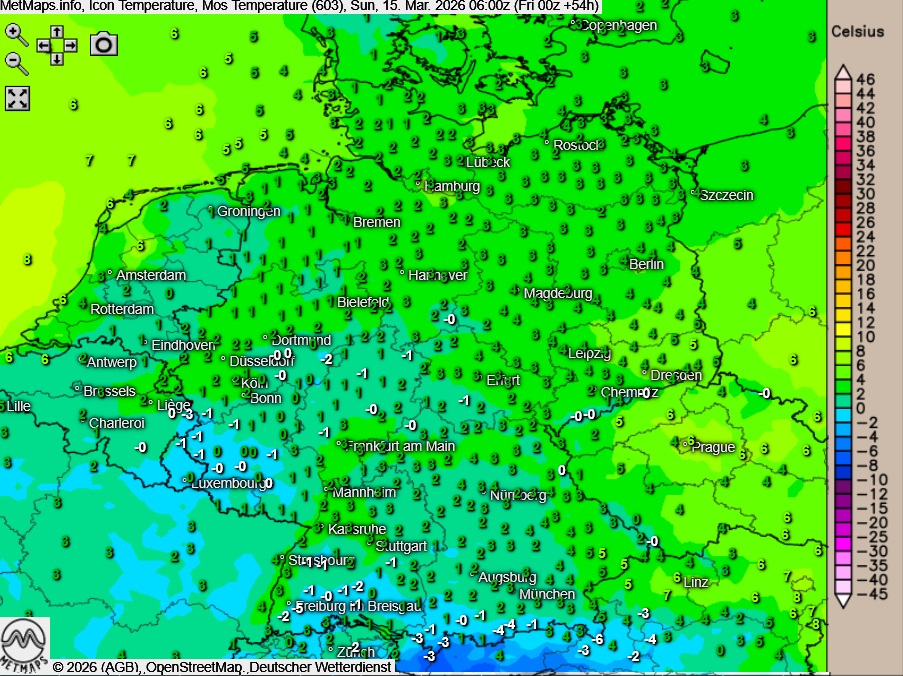 Die Wetter- / Temperaturkarte für Sonntagfrüh (06:00 Uhr) sowie die 24-Stunden-Regenmengen nach Icon: