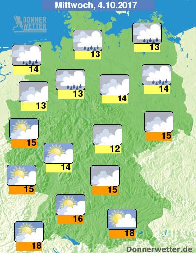 Sonst gibt es nach Auflösung örtlicher Nebelfelder eine Mischung aus Sonne und durchziehender Bewölkung, dabei bleibt es trocken. Mt 12 Grad in Thüringen und 18 Grad im Breisgau, sowie an der Donau und rund um München entsprechen die Temperaturen etwa der Jahreszeit.