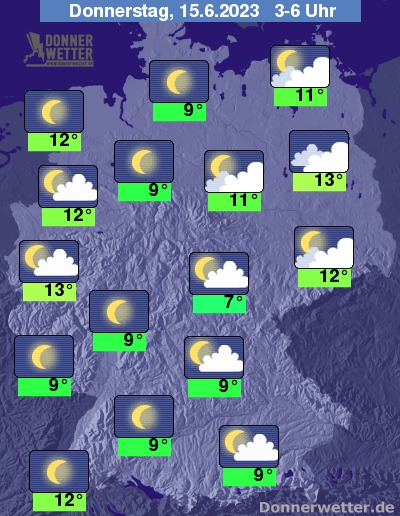 In der Nacht zum Donnerstag halten sich im Osten und Nordosten oft dichte, teils aufgelockerte Wolken. Im übrigen Land zeigt sich der Himmel meist sternenklar und sonst nur locker bewölkt. Bei Tiefstwerten von 13 Grad in Berlin und 7 Grad in Jena bleibt es landesweit trocken.