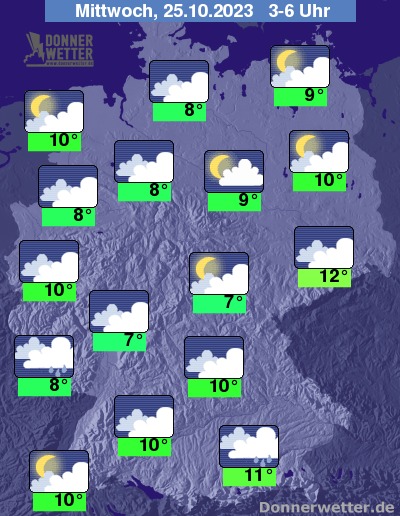In der Nacht zum Mittwoch klingen letzte Regenfälle in den östlichen Landesteilen nach und nach ab. Der Himmel bleibt aber überwiegend stark bis dicht bewölkt, vor allem im Nordosten kann es aber auch auflockern, es bleibt weitgehend trocken. Gegen Morgen zieht im Südwesten dann neuer Regen herein. Die Temperatur sinkt auf 12 Grad in Dresden und 7 Grad in Wiesbaden.
