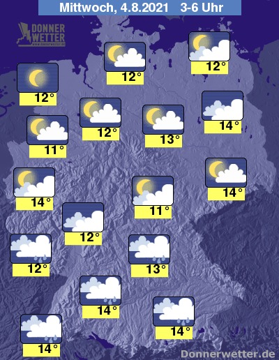 In der Nacht zum Mittwoch zeigt sich der Himmel über der Nordosthälfte Deutschlands überwiegend gering bis wechselnd bewölkt, dazu bleibt es hier trocken. Weiter nach Südwesten hin sind die Wolken dagegen immer dichter und es fällt auch gebietsweise Regen. Die Temperatur sinkt auf 14 Grad in Stuttgart und bis 11 Grad in Jena.