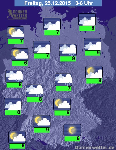 In der Nacht zum Freitag bleibt es im Süden bei einer meist lockeren Bewölkung und südlich der Donau bleibt es zudem auch bis zum Morgen weitgehend trocken. Im übrigen Bundesgebiet zieht zumeist dichte Bewölkung durch und vor allem über der breiten Mitte fällt auch gebietsweise Regen. Häufig auch locker oder aufgelockert bewölkt ist es indes sowohl im Osten des Landes als im weiteren Nachtverlauf auch im Nordwesten, hier bleibt es auch überwiegend trocken. Die Temperatur sinkt auf 9 Grad in Mannheim und bis 6 Grad in Mittelfranken. An den Küsten weht ein starker bis stürmischer Wind, besonders an der Nordsee sind weiterhin Sturmböen möglich.