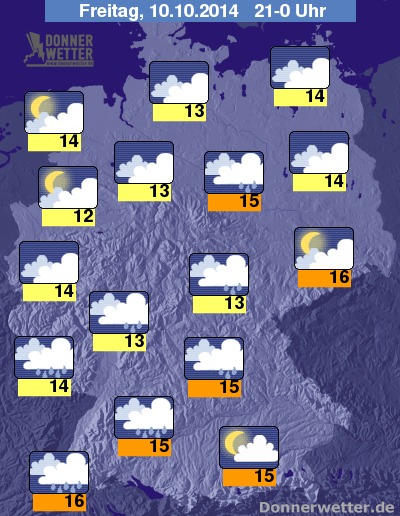 In der Nacht zum Samstag bleiben die Wolken weiterhin vielfach dicht, nach Nordwesten hin, vor allem aber im Südosten ist es aber auch häufig aufgelockert bewölkt, hierbei bildet sich jedoch örtlich Nebel oder Dunst. Regen fällt in einem breiten Streifen vom Südwesten Deutschlands, über die Mitte des Landes bis hoch zur Ostsee, sonst bleibt es weitgehend trocken. Die Temperatur sinkt auf 15 Grad im Breisgau und bis 9 Grad im Münsterland.