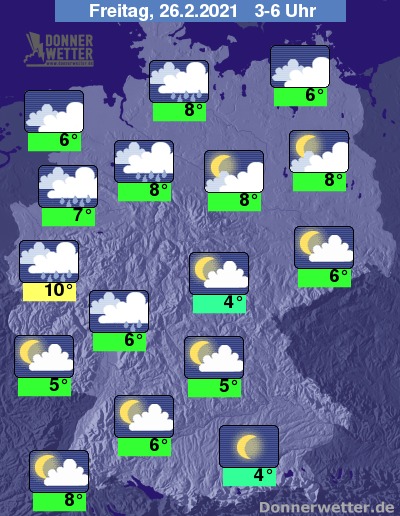 In der kommenden Nacht ziehen von Nordwesten her dichte Wolken heran, dazu fällt über der Nordwesthälfte der Republik auch zeitweise Regen. Weiter nach Südosten hin ist es anfangs noch sternenklar, im Laufe der Nacht nimmt aber auch hier die Bewölkung nach und nach zu, jedoch bleibt es hier bis zum Morgen noch weitgehend trocken. Die Temperatur sinkt auf 10 Grad im Rheinland und bis 4 Grad im Grabfeld.