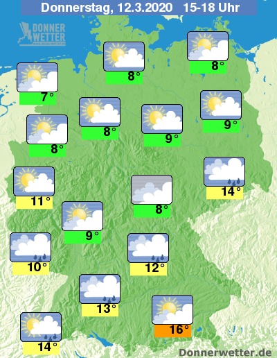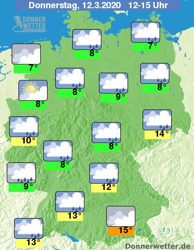 Am frühen Nachmittag fällt in einem Streifen vom Oberrhein, über die Mitte, bis zur Ostsee aus kompakten Wolken zeitweise Regen, dahinter stellen sich kurze Auflockerungen ein, gefolgt von örtlichen Schauern. Südlich der Donau bleibt es längere Zeit trocken, aber meistens bewölkt.