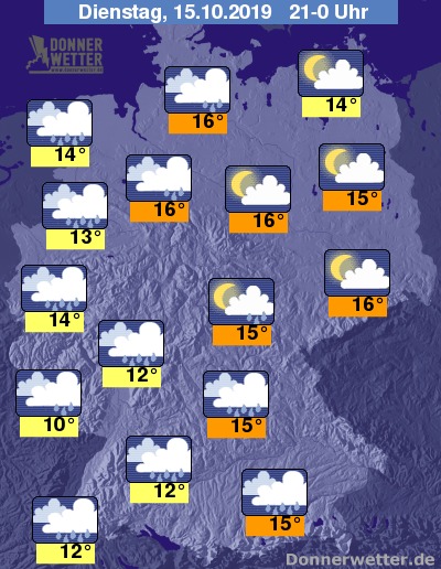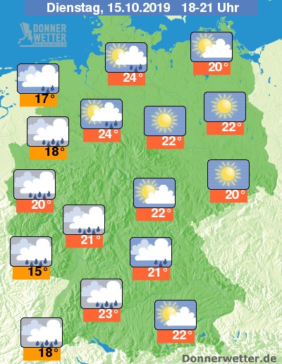 Am Abend breiten sich die Regengüsse von Südwesten und Westen über die Landesmitte aus und können teilweise kräftig und in Begleitung von Blitz und Donner ausfallen. Im Nordosten und Osten spendet die untergehende Sonne aber noch reichlich Helligkeit und wohltuende Wärme.