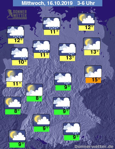 Bis zu den Frühstunden kühlt die Luft im Süden auf 7 bis 9 Grad und im Westen und Norden auf 10 bis 13 Grad ab, am mildesten bleibt es mit Werten bis 15 Grad in Teilen von Sachsen.