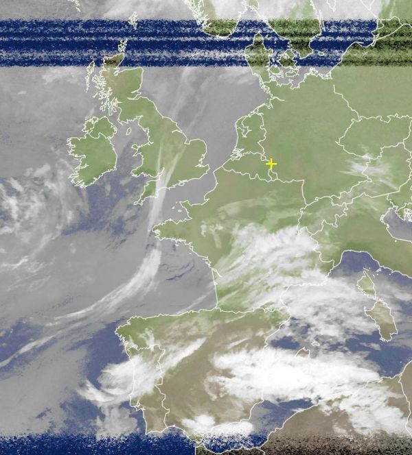 Auf dem Satellitenbild von heute Morgen sind die Wolken eines Tiefdruckgebiets mit Schwerpunkt über Südspanien zu erkennen. Hier kam es verbreitet zu Schauern und einzelnen Gewittern. Ein schwaches Tief liegt auch über dem südlichen Frankreich und sorgt hier für wolkiges Wetter mit zeitweiligen Schauern.