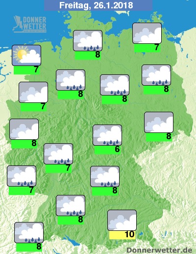 In einem schmalen Streifen vom Oberrhein bis zur Oder fällt noch gelegentlich Regen. Auch sonst bleibt der Himmel meistens wolkenverhangen und grau. Lediglich im Nordseeumfeld, sowie in Südostbayern scheint zeitweise die Sonne. Bei einem schwachen Wind bewegen sich die Temperaturen im Land zwischen milden 5 und 11 Grad.