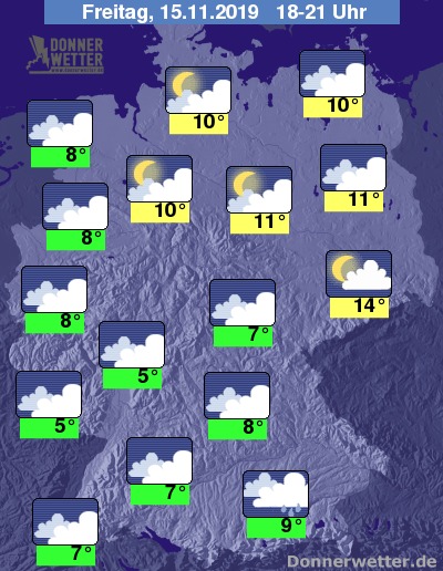 Vor Eintritt der Dunkelheit bewegen sich die Temperaturen noch zwischen 5 Grad im Saarland, der Pfalz, sowie im Rhein-Main-Gebiet und milden 14 Grad im sächsischen Tiefland.
