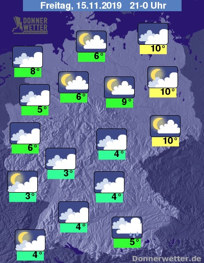 Bis Mitternacht ändert sich an der Wetterverteilung nur wenig, allerdings kann es im Süden und in den östlichen Mittelgebirgen zu regionalen Niederschlägen kommen, die im Bergland als Schnee fallen können. Die Temperaturen gehen allgemein leicht zurück.