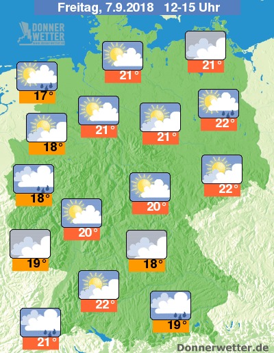 Im Laufe des Nachmittags kommen die Schauer bis nach Niedersachsen und Hessen voran. Auch im Küstenbereich und dem südlichen Bayern kann es nass werden. Sonst bleibt es bei einem freundlichen und meist trockenen Mix aus Sonne und Wolken. Die Temperaturen liegen meist zwischen 17 bis 22 Grad, bei längerem Sonnenschein können bis zu 24 Grad erreicht werden. Der Wind bleibt vor allem im Nordwesten spürbar, sonst weht er allgemein nur schwach bis mäßig.