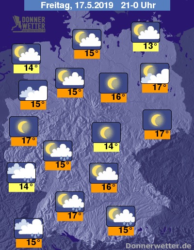 Am Abend gestalte sich der Himmel wechselnd wolkig, teilweise sind die Wolken dichter, teilweise gibt es größere Aufheiterungen. Örtlich fällt Regen oder es treten Schauer und einzelne Gewitter auf.