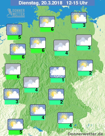 Heute Nachmittag halten sich über der breiten Landesmitte meist dichte Wolken, die vor allem im von der Mitte des Landes bis in den Osten gebietsweise Schnee bringen, sonst zeigen sich auch oft heitere Abschnitte oder es ist noch aufgelockert bewölkt, dabei bleibt es trocken. Die Temperatur liegt bei 1 bis 6 Grad.