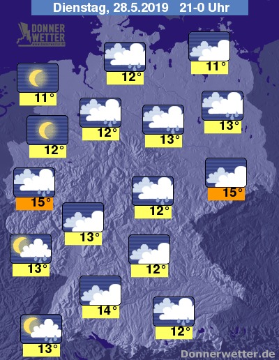 Am Abend fällt aus dichteren Wolken noch gebietsweise Regen, oder es treten Schauer auf. Nur im Küstenbereich von Nord- und Ostsee, sowie in Schleswig-Holstein bleibt es überwiegend freundlich und trocken.